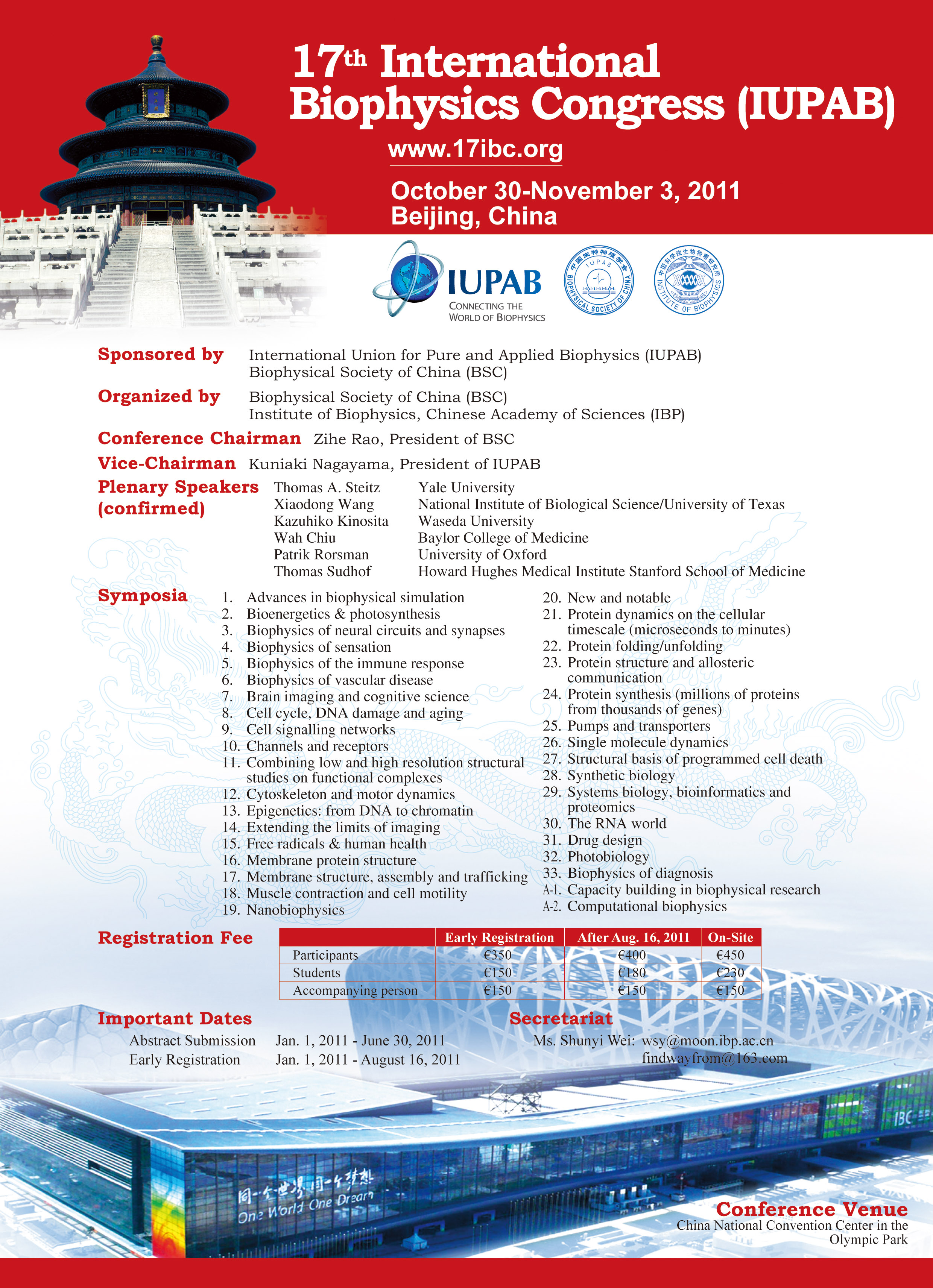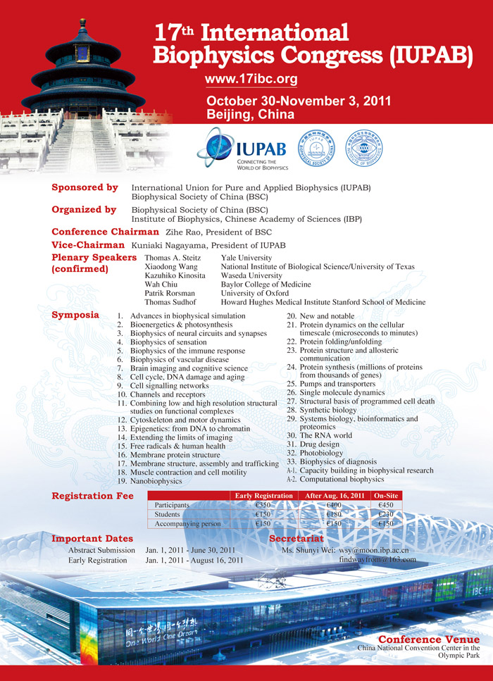 欢迎各位老师参加第17届国际生物物理大会(北京,国家会议中心,Oct.30-Nov.3,2011)。这是首次在中国召开的该领域最具影响力的国际学术盛会,每三年举办一次。届时将有多位诺贝尔奖获得者和200多位世界顶级科学家做学术报告。更多信息,请登录www.17ibc.org。