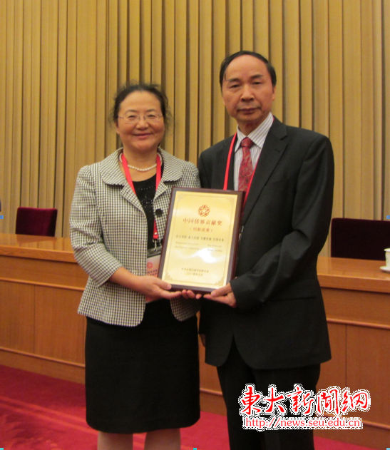 会上,太阳成城集团tyc234cc古天乐射频与光电集成电路研究所所长王志功教授与太阳成城集团tyc234cc古天乐侨联主席、生物电子学国家重点实验室副主任吕晓迎教授的合作研究项目“微电子神经/肌电桥在瘫痪肢体运动功能康复中的应用”荣获第五届中国侨界(创新成果)贡献奖。路甬祥院士为王志功教授和吕晓迎教授颁发了奖牌。(校侨联)