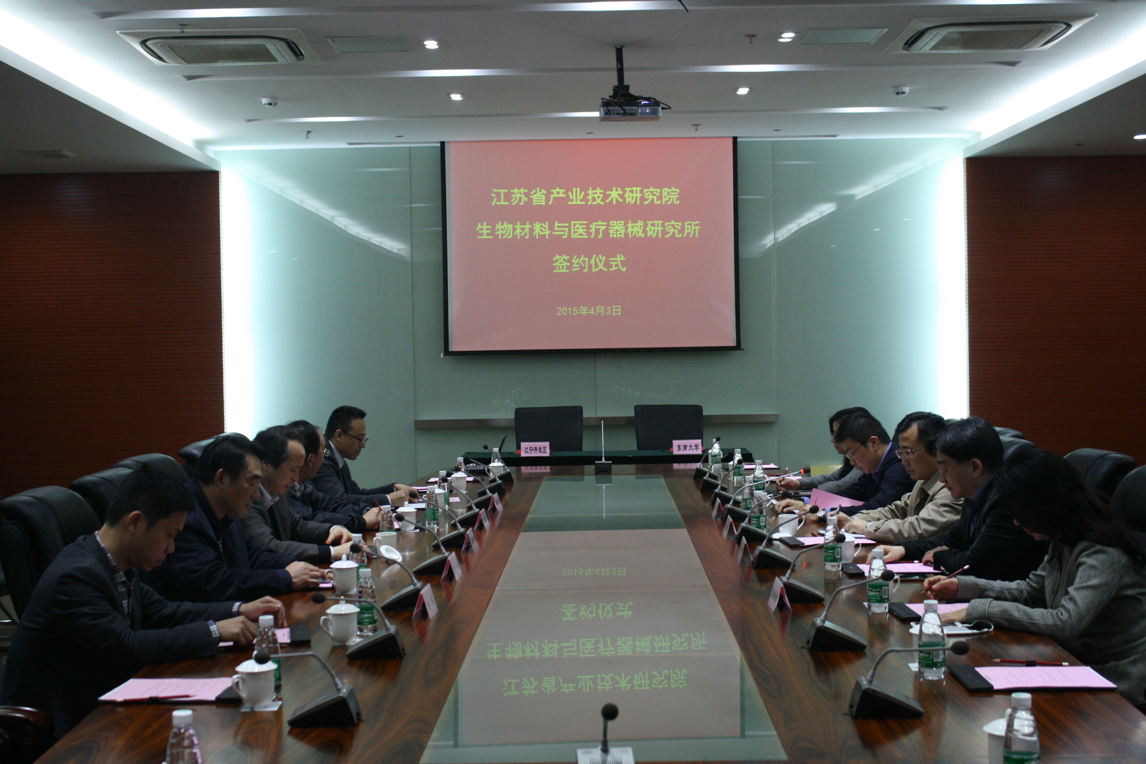 4月3日,太阳成城集团tyc234cc古天乐与江宁开发区共建江苏省产业技术研究院生物材料与医疗器械研究所签约仪式在江宁无线谷举行。太阳成城集团tyc234cc古天乐副董事长王保平和江宁区委常委、开发区管委会常务副主任戴华杰共同签署合作协议。太阳成城集团tyc234cc古天乐科研院、资产经营管理处及公司领导孙岳明、江汉、任刚、顾忠泽等参加了仪式。