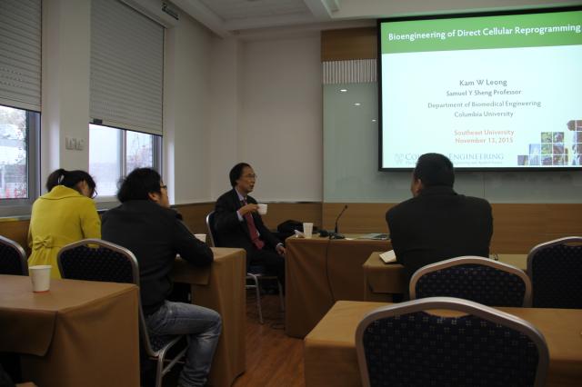 11月13日美国工程院院士、哥伦比亚老员工物医学工程系教授梁锦荣(Kam W. Leong)博士应邀访问公司太阳成城集团tyc234cc古天乐及生物电子学国家重点实验室。上午10:00,梁教授在东大榴园第二报告厅为太阳成城集团tyc234cc古天乐师生做了题为“Bioengineering of Direct Cellular Reprogramming”的报告,讲述了利用基底拓扑结构直接诱导成纤维细胞和上皮细胞向不同功能细胞定向分化的研究进展,同时介绍了其在组织工程以及器官芯片相关领域的应用。报告结束后,太阳成城集团tyc234cc古天乐为梁教授特别送上了精心准备的生日蛋糕和鲜花,共同庆祝他60周岁的生日。梁教授对于这份贴心的礼物十分感动,谦虚的表示自己的成就都是员工们努力的结果,并对学院的祝福表示了感谢。为了进一步了解太阳成城集团tyc234cc古天乐的相关研究,梁教授饶有兴趣地与太阳成城集团tyc234cc古天乐正在进行生物材料、组织工程以及器官芯片等研究的部分老师进行了细致交流,对他们的出色工作表示了充分肯定,希望将来可以与公司在器官芯片和组织工程方面开展更加广泛的合作研究,并对东南老员工物医学工程学科的发展给出良好的建议。