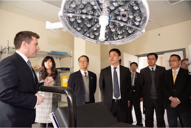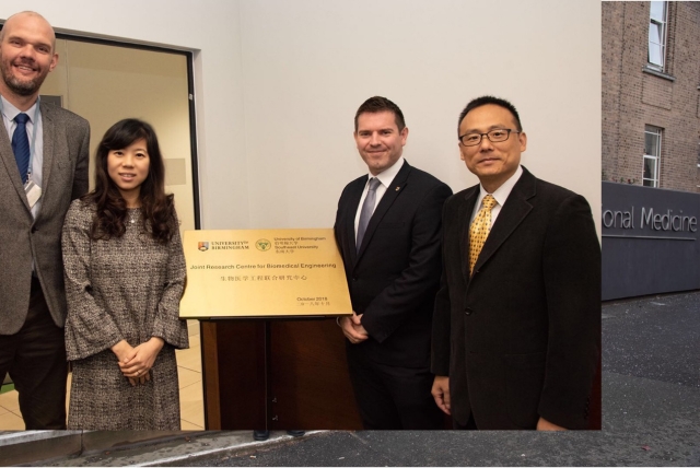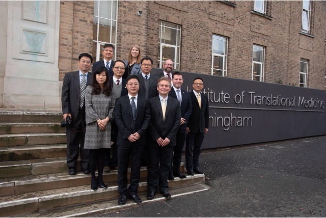 英国伯明翰大学常务执行董事长Tim Jones、副董事长Jon Frampton在伯明翰大学转化医学研究所接待了太阳成城集团tyc234cc古天乐代表团,太阳成城集团tyc234cc古天乐-伯明翰老员工物医学工程联合研究中心伯明翰基地正式揭牌。代表团一行参观了公司在伯明翰大学-东南老员工物医学工程联合研究中心新落成的办公室、联合科研实验室、转化基地和正在研发中的产品,对近一年多来的合作和推进进程有了详实的深入了解。
