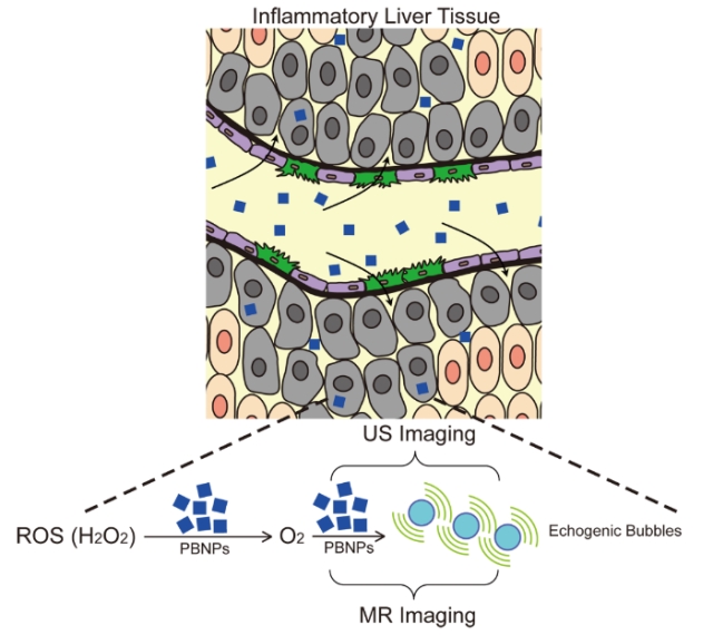 ROS诱导的过量H2O2的产生可以作为一种潜在的诊断标记物,用于判断多种病理状态的存在和进展。根据PBNPs在中性条件的类CAT酶活性能够催化H2O2分解为O2的特性,开发了基于PBNPs的高灵敏度、高分辨率的超声和磁共振双模成像探针,用于体内/外诊断H2O2 (图5)[6]。氧气泡的生成改变了氧化应激组织的声阻抗,使PBNPs作为超声造影剂来增强超声成像效果。同时,纳米颗粒表面Fe3+中心易于与H2O进行交换及具有顺磁性的氧气泡能够缩短T1弛豫时间,使PBNPs还能作为T1磁共振造影剂。