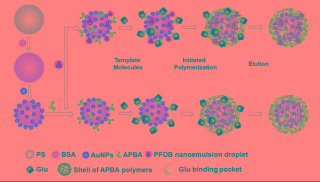 纳米酶缺乏对催化底物的选择性一直以来是制约纳米材料在实际应用中代替天然酶的重要因素之一,同样也是国内外科研人员致力于解决的重要问题。为此,采用氨基苯硼酸在碱性条件下结合葡萄糖分子的邻位羟基,将葡萄糖分子印记在金纳米颗粒(AuNPs)表面,经洗脱后,在AuNPs表面留下葡萄糖分子口袋。随后氨基苯硼酸聚合形成分子印迹壳层,这种策略实现了AuNPs作为类氧化酶对底物葡萄糖的选择性(图4)。此外,加入具有供氧能力的全氟溴辛烷能够进一步加强AuNPs的催化活性。与单纯的AuNPs相比,本工作制备的具有葡萄糖分子印迹壳层的载氧AuNPs的催化效率提升了270倍,并成功用于实际样品(饮料、血液)中葡萄糖含量的检测[5]。