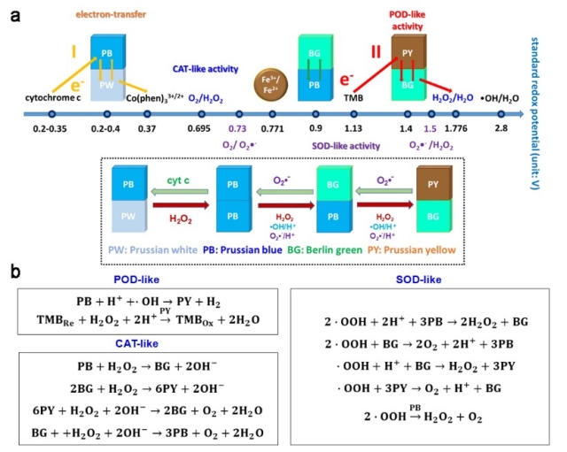 活性氧(ROS)的产生是纳米材料毒性的重要机制之一。研究发现普鲁士蓝纳米粒颗粒(PBNPs)具有类POD、CAT、超氧化物歧化酶(SOD)等多酶活性,并能够有效清除ROS[3]。机制研究表明,与氧化铁纳米颗粒类芬顿反应产生·OH不同,PBNPs能够抑制·OH的生成。作者首次推测,PBNPs的类多酶样活性可能是由于PBNPs丰富的氧化还原电位使其成为高效的电子转运体(图3)。为了研究PBNPs清除ROS的能力,建立了一系列的体外ROS生成模型,包括化学药物刺激、脂多糖诱导炎症、紫外线照射、神经细胞缺氧复氧等,PBNPs加入均能清除产生的ROS,有效抗氧化并提高细胞活性,并且具有剂量依赖性。同时采用脂多糖诱导建立了小鼠炎症模型,同样表明了普鲁士蓝纳米颗粒能够抑制炎症反应。
