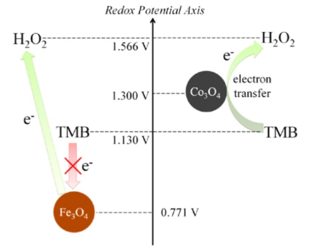 本研究证明了四氧化三钴纳米颗粒(Co3O4 NPs)具有类CAT、POD和SOD 酶活性[4]。利用电子自选共振技术研究其催化机制,表明Co3O4 NPs的类POD活性不遵循类芬顿反应产生·OH,而是Co3+/ Co2+较高的氧化还原电位使Co3O4 NPs具有较强的氧化性,可作为电子传递介质将TMB的电子直接转移给H2O2(图2)。在中性条件下,H2O2倾向于缓慢分解,Co3O4 NPs有助于加速这一过程,因为H2O/O2的氧化还原电位很低,H2O2很容易被Co3+氧化。基于Co3O4 NPs较强的类POD酶活性,作者设计了一种新的免疫组化方法,将Avastin抗体偶联到Co3O4 NPs表面,获得的偶联物用于检测肿瘤组织中过表达的血管内皮生长因子(VEGF)。