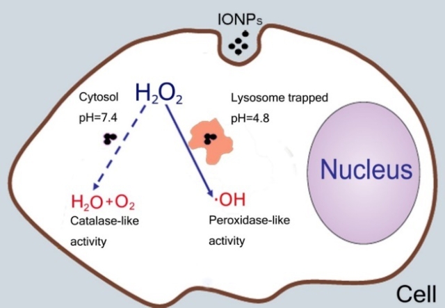 该研究利用电子自旋共振技术(ESR)首次发现氧化铁纳米颗粒(IONPs)具有pH依赖的类双酶活性:在酸性条件下,IONPs能够与H2O2反应,生成具有高毒性的羟自由基(·OH),表现出类过氧化物酶(POD)活性;在中性条件下,能够催化H2O2的歧化反应,分解为无毒的H2O和O2,表现类过氧化氢酶(CAT)活性[2]。该研究证明IONPs在细胞中的分布及细胞内微环境是影响其细胞毒性的重要因素,即:当IONPs定位于细胞溶酶体中,将产生较强的毒性作用;定位于细胞质中则具有较好的解毒作用(图1)。因此,溶酶体逃逸策略是一种有望降低IONPs给药中长期毒性的有效方法。