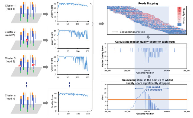 由于G-四联体重要生物学功能,在基因组范围内识别形成G-四联体结构的序列显得尤为重要,也是目前的研究难点之一。针对上述问题,陆祖宏、涂景团队基于多年的高通量测序研究积累,发展了一种基于测序质量分析的全基因组G-四联体结构鉴定方法,通过分析常规重测序中由于G-四联体结构导致的测序质量值的微小波动,在全基因组范围内识别形成G-四联体结构的序列,并开发了分析工具G4-miner。