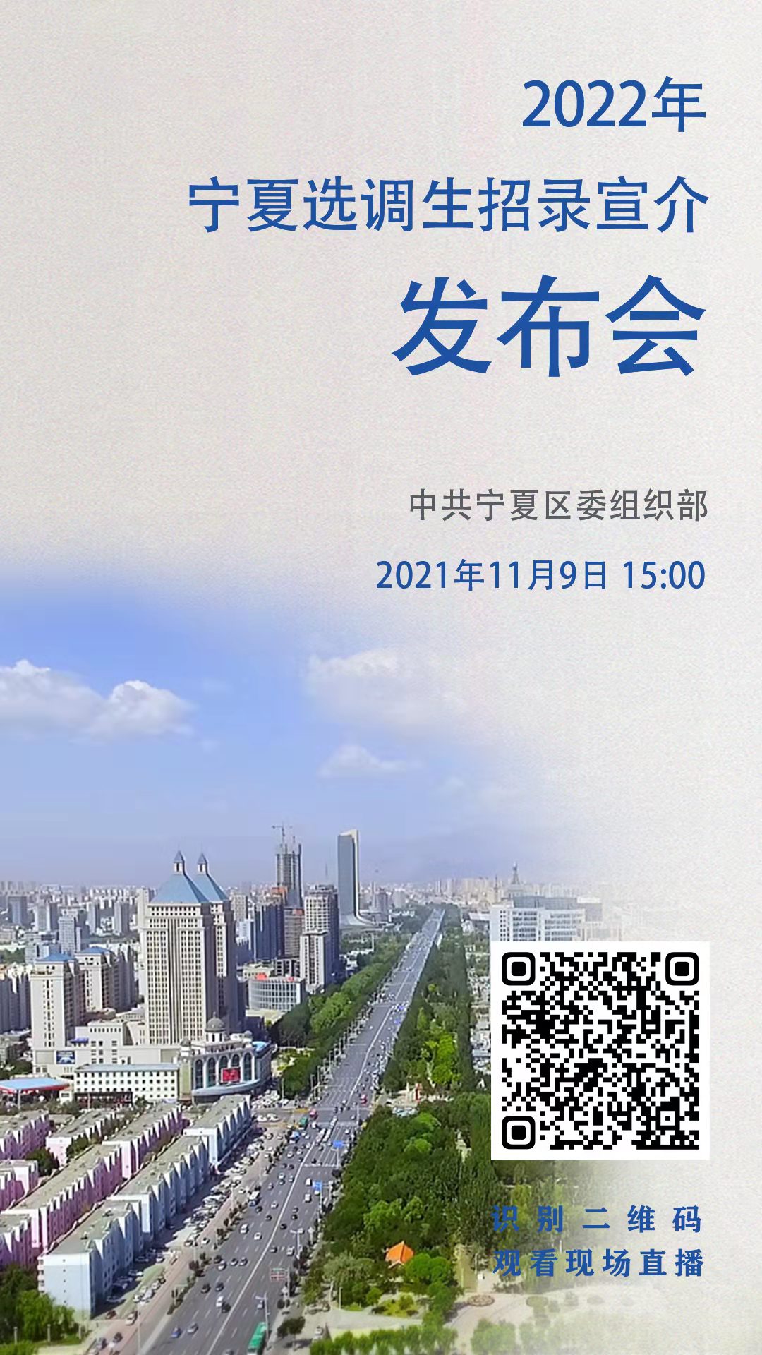 为吸引优秀高校应届毕业生选择宁夏、投身宁夏干事创业,宁夏区委组织部拟定于2021年11月9日下午3:00举行线上选调生招录宣介发布会。具体安排如下: