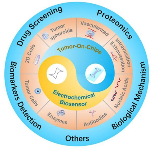 基于组织工程和微流控技术的肿瘤芯片在药物筛选、肿瘤发生和转移机制研究、个体化精准治疗等方面极具应用潜力。现有的面向肿瘤芯片的传感分析平台往往涉及到复杂昂贵仪器设备的使用,并且存在难以长程连续传感、样品消耗量大等问题。集成微型化、低成本、高灵敏电化员工物传感器的肿瘤芯片不仅可以从分子和细胞层面反映体外肿瘤模型的生理状态,而且可以实现原位实时连续监测。该文章对肿瘤芯片的构建方法,以及电化员工物传感器在肿瘤标志物检测、肿瘤微环境变化、肿瘤代谢分析等方面的应用进行了系统的总结,并展望了三维柔性电化学传感器在集成化肿瘤芯片中的潜在应用。