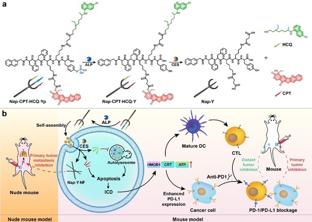 转移引起的癌症高死亡率迫切需要新的方法来同时抑制原发性肿瘤转移和远端肿瘤生长。梁高林教授课题组合理设计出一种三叉戟分子Nap-CPT-HCQ-Yp(见下图),其具有三个功能性的“矛”(即用于酶促自组装的磷酸酪氨酸、用于化疗的喜树碱和用于抑制自噬的羟基氯喹)。在肿瘤标志物碱性磷酸酶和羧酸酯酶的顺序作用下,Nap-CPT-HCQ-Yp发生纳米刷-纳米粒子-纳米纤维的转变,同时释放化疗药物喜树碱和自噬抑制剂羟基氯喹。细胞内形成的纳米纤维有效地抑制癌细胞的转移和侵袭行为;释放的羟基氯喹通过抑制细胞自噬从而增强喜树碱的化疗效果。研究中发现,上述的三重协同作用在高效杀死原发肿瘤细胞的同时能够诱发机体发生免疫原性死亡效应。基于此,作者进一步联合免疫检查点抑制剂诱导全身免疫反应。动物实验结果表明,该策略同时抑制了原发性肿瘤和远端肿瘤,显著提高了肿瘤转移的抑制效果。