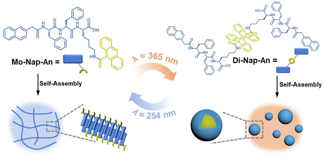 凝胶是具有三维纳米网络结构的一类软物质材料,近年来凝胶已经从静态材料发展到具有刺激响应性的智能材料。然而对于凝胶刺激响应性机理的研究有待完善。为了阐述刺激响应性凝胶性质变化的机理,梁高林教授课题组开发了一种光响应性蒽肽凝胶剂Mo-Nap-An,该凝胶剂由光响应性的蒽以及多肽凝胶剂Nap-FFK组成。Mo-Nap-An通过π-π堆叠和氢键作用排列成有序的纳米纤维结构。在365 nm激光照射下,凝胶剂中的蒽发生二聚化反应,使Mo-Nap-An转化为对应的二聚体Di-Nap-An。增强的疏水相互作用促使纳米纤维坍塌并形成纳米颗粒,宏观上实现了从凝胶到溶液的转变。相反地,在254 nm紫外光照射下,二聚体Di-Nap-An转化为单体Mo-Nap-An,纳米颗粒重新组装为纳米纤维,宏观上溶液重新转化为凝胶(见下图)。该研究展现了可逆的凝胶性质光调控策略,对于凝胶-溶液体系的动态响应性探索具有重要意义。