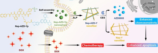 现阶段,化疗仍然是一种有效且普遍的癌症治疗方案,但其临床效果仍受限于抗癌药物的低反应率和严重的全身毒性。因此,迫切需要开发一种全新的策略来促进肿瘤的化疗敏感性,同时减少化疗药物的毒副作用。基于此,梁高林教授课题组合理设计出一种多肽药物Nap-AZD-Yp,将细胞内“智能”地纳米纤维组装与自噬诱导剂释放相结合,实现了肿瘤特异性化疗增敏策略(见下图)。在肿瘤组织高表达的碱性磷酸酶和羧酸酯酶的顺序作用下,Nap-AZD-Yp经历了纳米球向纳米纤维的形貌转变,同时释放出自噬诱导剂AZD8055。细胞实验显示,纳米纤维的形成导致癌细胞机械张力增加,进而促使癌细胞对于化疗药物阿霉素的内吞作用增强。释放的AZD8055进一步激活癌细胞的过度自噬,增加癌细胞对化疗的敏感性。动物实验结果表明,Nap-AZD-Yp可显著增强阿霉素对肿瘤的治疗效果,同时减轻其对正常组织的毒副作用。该研究所使用的“智能”响应概念对于未来开发用于治疗癌症和其他疾病的新型联合疗法具有重要意义。