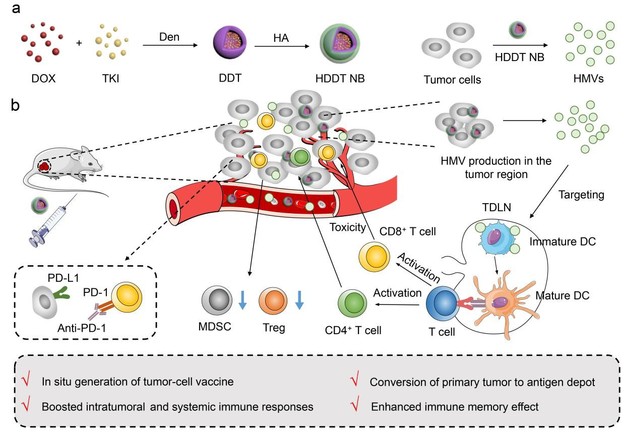 吴富根教授课题组将阿霉素和酪氨酸激酶抑制剂共同负载在树枝状高分子的疏水内核,并在外部包裹透明质酸,制备出了一系列纳米药物(即HDDT纳米颗粒)。实验发现,该HDDT纳米药物可以发挥类似“纳米炸弹”的作用,能将各种癌细胞(大小为10-30微米)裂解为微米大小的细胞囊泡(1.6−3.2 μm),且具有约100%的细胞至微米囊泡的转化效率。通过蛋白组学和体外免疫细胞的激活等相关表征证明了所产生的微米囊泡具有很强的免疫刺激作用,并可以用作肿瘤疫苗。尾静脉注射该“纳米炸弹”之后,可以在肿瘤组织中大量原位生成携带有肿瘤相关抗原和危险因子的微米囊泡,并将肿瘤组织原位转化为疫苗库,从而引发机体全身性的抗肿瘤免疫反应,实现癌症的免疫治疗。