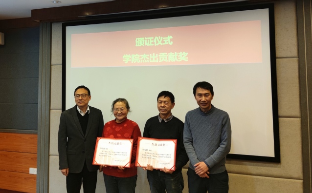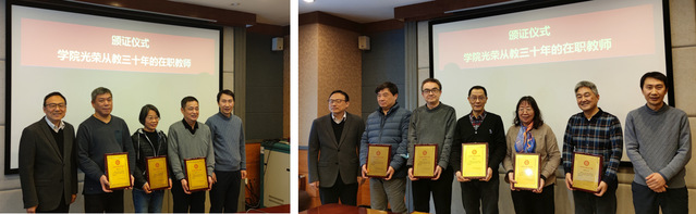刘宏副经理主持颁证环节,依次颁发学院杰出贡献奖:吕晓迎、何农跃;学院光荣从教三十年的在职教师:陆祖宏、孙啸、赵兴群、钱卫平、柏毅、黄雷、夏兰、洪庆月、夏翎;学院光荣退休教师:吕晓迎、林海音、高庆华、孙宁、张亚贤。