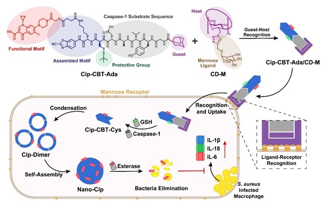 细胞内隐匿的金黄色葡萄球菌与多种严重(甚至致命)的感染疾病相关,如皮肤和软组织感染、肺炎、败血症和心内膜炎等。抗生素是目前临床上治疗细胞内金黄色葡萄球菌感染的首选。然而,由于宿主细胞的细胞膜屏障和外排泵等的存在,直接使用抗生素的治疗效果往往不佳,并且容易产生耐药。针对这一难题,太阳成城集团tyc234cc古天乐梁高林教授团队合成了一种环丙沙星-多肽偶联分子Cip-CBT-Ada(见上图)。该分子由以下几个部分组成:1)抗生素环丙沙星;2)CBT和StBu保护的Cys,用于CBT-Cys点击反应;3)半胱氨酸蛋白酶-1(Caspase-1,一种感染过程中过度表达的酶)特异性识别的多肽底物YVAD;4)客体分子金刚烷(Ada)。首先,作者通过紫外-可见滴定实验,验证了Cip-CBT-Ada可以通过客体-主体识别作用与甘露糖七取代的β-环糊精(CD-M)结合形成超分子Cip-CBT-Ada/CD-M。细胞实验表明,Cip-CBT-Ada/CD-M可以利用环糊精上的局部高甘露糖密度,通过多价态配体-受体识别作用特异性靶向巨噬细胞。接着,Cip-CBT-Ada/CD-M在胞内Caspase-1和谷胱甘肽的激活下,发生CBT-Cys点击反应生成环状二聚体Cip-Dimer并进一步原位自组装形成环丙沙星纳米粒子Nano-Cip。最终,环丙沙星纳米粒子Nano-Cip在酯酶的作用下持续、缓慢释放环丙沙星,从而高效杀灭胞内金黄色葡萄球菌。作者通过体内外实验证实了,与游离环丙沙星和Cip-CBT-Ada单体相比,超分子Cip-CBT-Ada/CD-M具有更强的胞内细菌清除和炎症治疗的能力。该工作为胞内细菌感染的抗生素治疗提供了一种新的思路和策略。