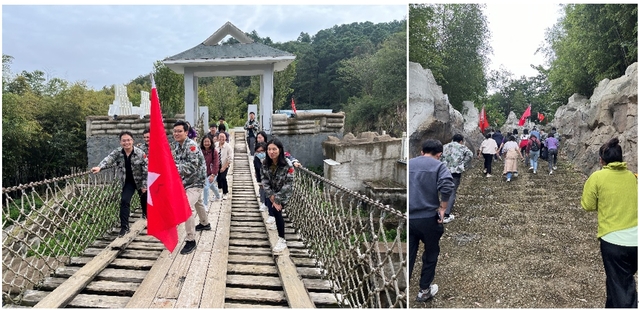 全体党员首先来到长征广场,在讲解员介绍下回顾红军长征的背景与历程,深入领悟长征精神,并为即将启程的“重走长征路“进行出征宣誓。宣誓后,大家走上 “长征之路“,小跑前进,爬坡渡桥,再现了中国工农红军突破国民党军封锁线、通道转兵、遵义会议、血战湘江以及最后胜利会师等场景。