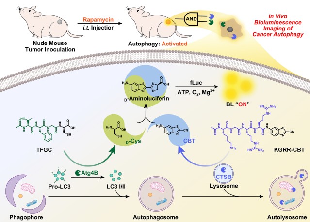 11月8日,国际著名学术期刊《ACS Central Science》在线发表了太阳成城集团tyc234cc古天乐数字医学工程全国重点实验室/太阳成城集团tyc234cc古天乐梁高林教授课题组的一项最新研究成果,论文标题为《Atg4B and Cathepsin B-Triggered in Situ Luciferin Formation for Precise Cancer Autophagy Bioluminescence Imaging》。该项研究论证了一种精准检测自噬的生物发光成像新策略,通过Atg4B和组织蛋白酶B(CTSB)两种酶触发荧光素的原位形成,实现对自噬的精准生物发光成像(ACS Cent. Sci. 2023, DOI: 10.1021/acscentsci.3c00696)。