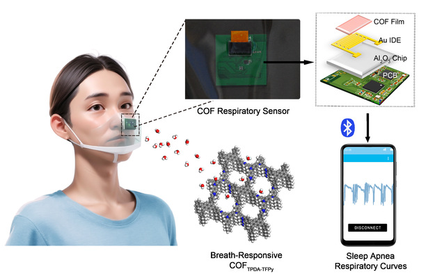 睡眠呼吸暂停是一种普遍且可能引发严重后果的常见慢性呼吸系统疾病,数以亿计的病人无法全部由医院诊断,面临着缺乏有效的睡眠呼吸居家自我监测手段的问题。针对这一问题,团队设计开发了一种无线智能家用睡眠呼吸监测系统。呼吸传感系统包括基于呼吸响应COFTPDA-TFPy材料的传感芯片、微型化PCB电路板、开放式口罩器件与手机数据收集APP。其中,设计的核心传感材料COFTPDA-TFPy具有亲疏水位点交替的长程有序的微孔结构,对呼吸过程中接近体温的高湿度气体具有亚秒级的快速响应能力,在连续8小时的睡眠呼吸监测中稳定循环数千次,并对室温环境湿度具有良好的抗干扰能力。借助这样的特性,呼吸传感系统成功记录呼吸功能正常被试者、原发性鼾症患者及不同病症程度的呼吸暂停患者的睡眠呼吸曲线,有效区分不同人群的睡眠呼吸行为特征。值得注意的是,该呼吸传感系统可完全由被试者自行在居家环境操作,为庞大的睡眠呼吸暂停人群提供了一种便携化数字化的居家主动医疗手段,在睡眠呼吸暂停以及其他呼吸系统异常疾病的临床诊断与监测中展现出了广阔的应用前景。