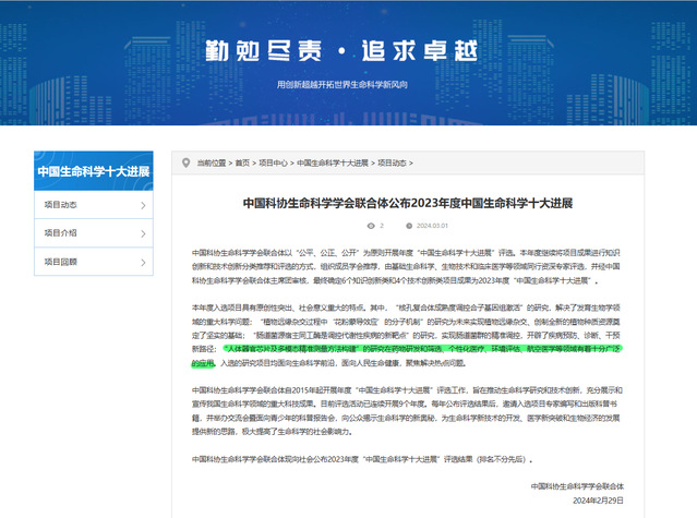 延伸阅读:中国科协生命科学学会联合体(简称“学会联合体”)是中国科协首个学会联合体,成员包括中国动物学会、中国生物医学工程学会等23家全国学会。学会联合体自2015年起开展年度“中国生命科学十大进展”评选工作,已连续开展9个年度,旨在推动生命科学领域的创新发展,充分展示和宣传我国生命科学领域的重大科技成果。