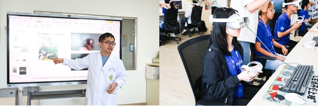 元宇宙项目实验环节,由青钊副教授指导学员进行实践体验。在青钊老师的带领下,学员们亲身体验了VR设备,进一步学习了VR成像和场景开发的原理,并在VR小游戏中增进对该技术的了解。