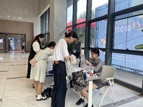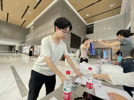 8月21日下午,营员携带核验资料来到医工大楼报到。志愿者当场核验入营营员资料,并为营员发放事先准备好的文化衫、餐券等物资。