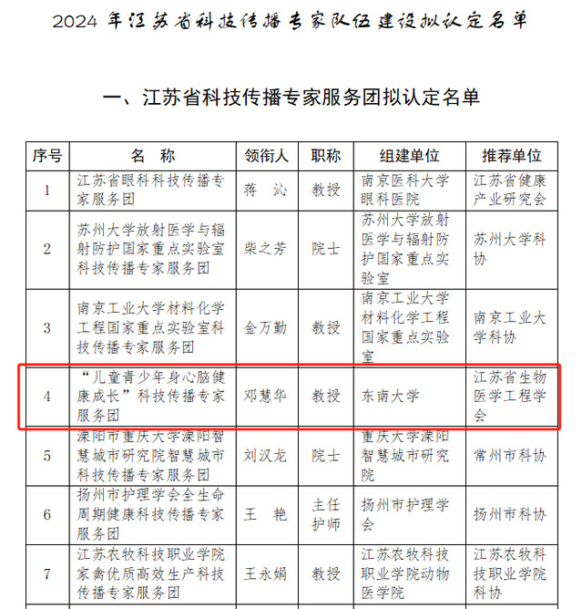 日前,2024年江苏省“全国科普日”优秀科普人才建设江苏省科普专家团队发布。经由江苏省生物医学工程学会推荐,公司邓慧华教授领衔申报的“儿童青少年身心脑健康成长”科普专家团队获得了江苏省科学技术协会的正式认定。