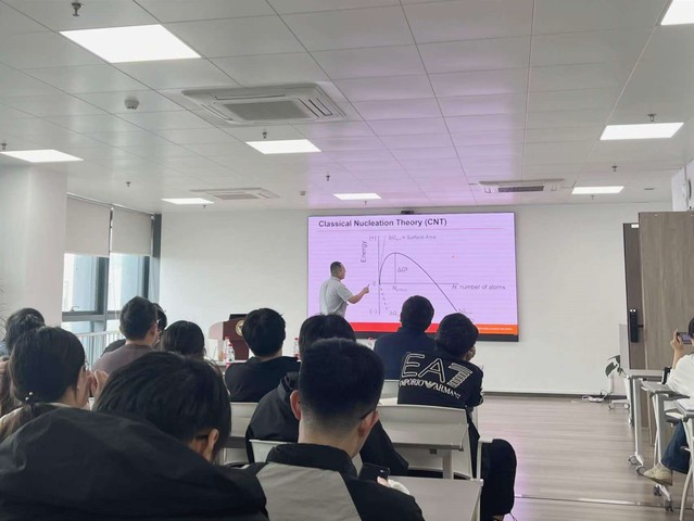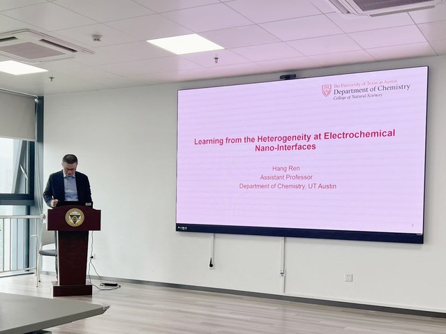 本次任航教授报告的主题为“Learning from the Heterogeneity at Electrochemical Nano-Interfaces”。在报告中,任航教授围绕电化学反应和电催化、电化学活性的非均质化、纳米级电化学成核及其理论、定位成像和电化学数据等方面进行了深入阐述,通过一系列的经典理论公式与图像,深入浅出地给在场老师同学上了一堂生动的电化学课程。
