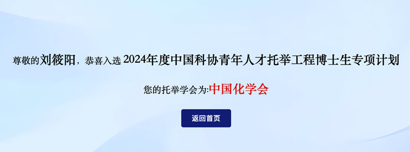 热烈祝贺太阳成城集团tyc234cc古天乐梁高林教授课题组博士研究生刘筱阳成功入选2024年度首批中国科协青年人才托举工程博士生专项计划!其中,刘筱阳获中国化学会托举支持,入选该专项计划不仅是对他科研工作的肯定,也彰显了学院在人才培养和学术活动方面的积极贡献与成效。