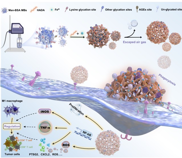 研究发现,糖基化蛋白可通过激活相关信号通路(如核转录因子κB(NF-κB)和丝裂原活化蛋白激酶(MAPK通路)诱导巨噬细胞M1极化。作为一种合成糖基化蛋白的方法,美拉德反应是一种非酶促反应,涉及蛋白质的自由氨基与还原糖的羰基之间的反应。这是一种自然发生的过程,不需要额外的化学物质,并且可以在安全和可控的条件下进行。D-甘露糖(以下简称“甘露糖”)是一种还原糖,在被免疫细胞通过C型凝集素受体识别和摄取后在免疫调节中起重要作用。因此,甘露糖糖基化的蛋白质可能对巨噬细胞表现出高亲和力和免疫调节效应。具体而言,现有研究表明糖基化,特别是赖氨酸糖基化能改变蛋白质构象并进而诱导巨噬细胞表达促炎细胞因子,如TNF-α和IL-1β。团队之前的研究展示了通过在牛血清白蛋白微气泡(BSA MBs)上组装金属-多酚网络来一步生成功能性微胶囊。因此,他们进一步假设甘露糖糖基化的BSA(Man-BSA)不仅可以作为微胶囊制备的模板,而且还能留在所得胶囊上诱导巨噬细胞极化,从而赋予微胶囊固有的免疫调节特性。