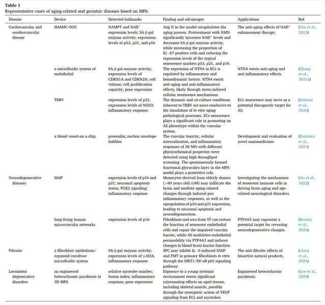 MPS 通常集成微流体和组织工程技术来复制人体的关键生理特征,从而可以更准确地模拟组织功能和疾病进展。这些研究中开发的模型已用于探索病理机制、测试治疗干预措施和更高精度地筛选药物。文章详细介绍了 MPS 的设计、材料和流体动力学特性,特别是MPS在衰老疾病的表型和生物学表现及生物标志物方面的研究进展。MPS 平台通过提供更具生理相关性的体外模型,显著增强了我们对与年龄相关和老年疾病潜在机制的理解。这些模型有可能通过提供更具预测性的临床试验模型,彻底改变与年龄相关和老年疾病的药物发现和开发,最终减少时间和成本。此外,MPS 在衰老研究中的应用可以弥合临床前模型和患者结果之间的差距,推动该领域的发展,使与年龄相关和老年疾病的治疗更加精准和有效。随着 MPS 技术的不断进步,它在研究人类衰老和治疗干预方面的更广泛意义可能会扩大,为科学发现和治疗创新提供新的机会。