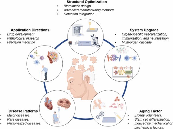 衰老是一个渐进且不可逆转的过程,伴随的是组织功能的衰退和各种衰老相关疾病和老年病的风险显著增加。尤其是在全球老龄化加速和流行病广泛出现的矛盾背景下,衰老相关疾病和老年病已成为个人死亡和残疾的主要原因,引起了研究人员和投资者越来越多的关注。在模拟和研究与年龄相关和老年病的模型方面,虽然传统的体外系统和动物模型已显示出一定程度的效用,但过去关于抗衰老干预措施的证据大多局限于非哺乳动物模型生物,包括酵母、线虫和果蝇。最近在小鼠身上进行的实验也证明了某些特征或干预措施的有效性。然而,这些模型在完全复制人类生理过程方面存在固有的局限性。近年来,微生理系统 (MPS) 利用组织工程和微流体技术的进步,已成为极具前景的平台。MPS 能够在微加工设备中复制组织微环境的关键特征,提供仿生组织培养条件,增强对完整或精确的人体结构和功能的体外模拟。这种能力提高了临床试验结果的可预测性,同时减少了时间和成本。包括类器官和器官芯片技术在内的 MPS 的发展为研究与年龄相关和老年病开辟了新的途径。
