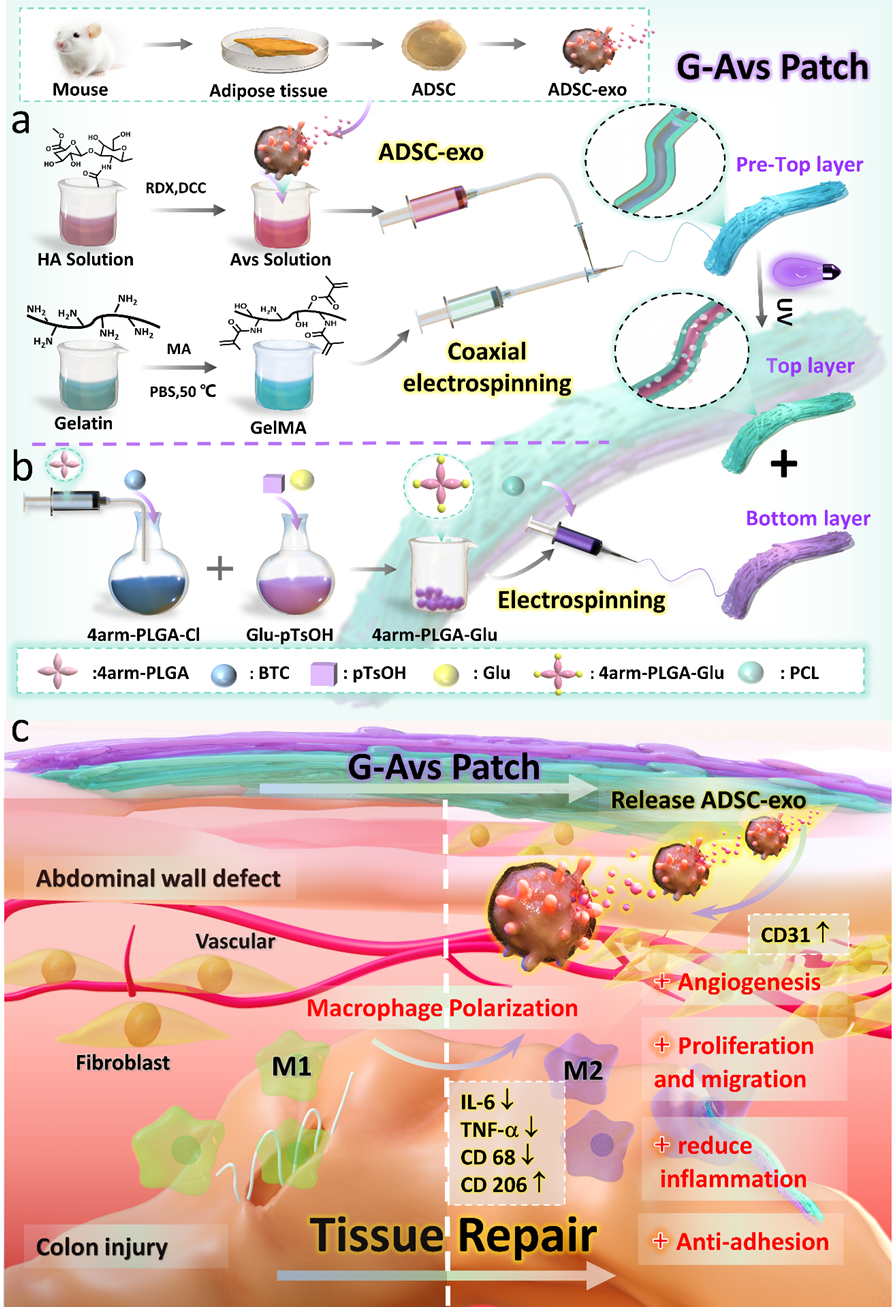 综合体外与体内研究结果,G-Avs补片凭借其双层功能设计,在肠道及腹壁缺陷修复中展现出广阔的临床应用潜力,为慢性伤口及术后组织修复提供了全新的解决方案。有巨大的临床转化潜力。
