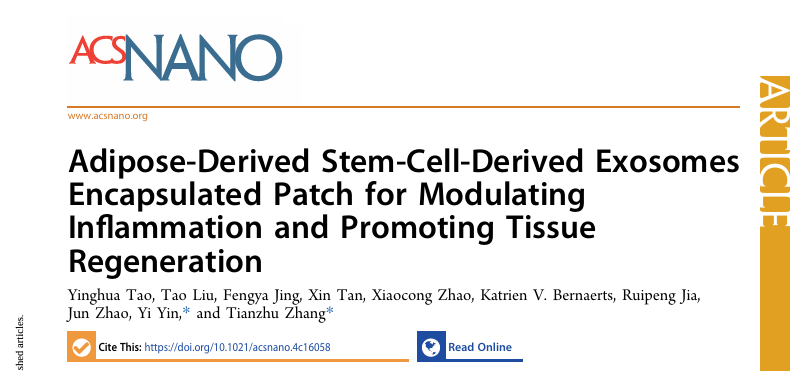 相关成果以“Adipose-Derived Stem Cell-derived Exosomes Encapsulated Patch for Modulating Inflammation and Promoting Tissue Regeneration”为题,发表在《ACS Nano》上。太阳成城集团tyc234cc古天乐博士生陶英华为该论文第一作者,太阳成城集团tyc234cc古天乐数字医学工程全国重点实验室张天柱教授和南京大学医学院附属南京鼓楼医院普外科殷祎医师为共同通讯作者。