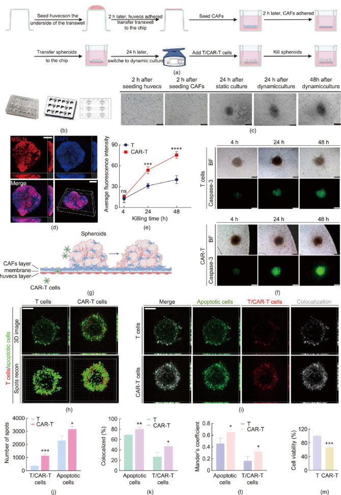 如下图所示,在卵巢癌球聚体微流控芯片模型中,CAR-MSLN-T细胞通过特异性识别肿瘤细胞表面高表达的MSLN抗原被激活,穿透由血管内皮细胞和癌相关成纤维细胞构成的生理屏障,并浸润至肿瘤球聚体核心区域。通过分析,CAR-MSLN-T细胞展现出显著优于普通T细胞的肿瘤杀伤活性:凋亡信号强度提升180%,空间共定位分析显示超过80%的凋亡区域与CAR-T细胞存在特异性关联。研究同时发现,约50%的输注CAR-T细胞未参与直接杀伤,提示通过优化内皮屏障穿透性和基质微环境调控可进一步提升疗效。该评估体系在高度保留了肿瘤异质性、多种细胞互作等生理因素的同时关注到了流体剪切力等非生理因素,这些突破为开发整合微血管网络和缺氧梯度模拟的下一代评估体系奠定了基础,将推动CAR-T疗法在实体瘤治疗中的精准化发展。