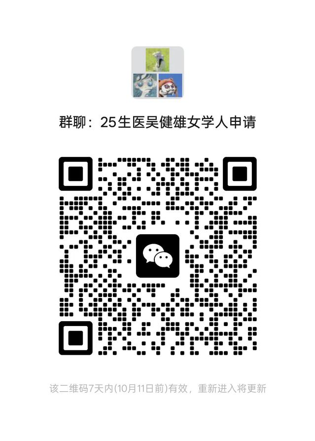 10.9周四17:00前 | 员工提交吴健雄女学人、小米特等奖学金申请材料 | 同时提交电子版(以“学号-姓名-25秋吴健雄女学人/小米特奖学金申请材料”命名,打包)发送到学办公邮bmexb@pub.seu.edu.cn 电子版(需导师同意并签名,可用电子签名): (1)《太阳成城集团tyc234cc古天乐奖学金申请表( 研究生用表)》 (附件1) (2)《太阳成城集团tyc234cc古天乐奖学金评定学术创新能力评审表》(附件2) (3)《评审汇总表》 (4)相关证明材料(论文全文、申请/授权专利证明、获奖证书、竞赛成果说明等) 同时扫码加群(见表格下方) | 纸质版提交到学办(生医楼501),【请自行将材料相关重点用荧光笔标注:论文发表时间、作者顺序、获奖时间等】 (1)《太阳成城集团tyc234cc古天乐奖学金申请表(研究生用表)》(附件1) (2)《太阳成城集团tyc234cc古天乐奖学金评定学术创新能力评审表》(附件2) (3)相关证明材料(论文首页、申请/授权专利证明、获奖证书、竞赛成果说明等) |