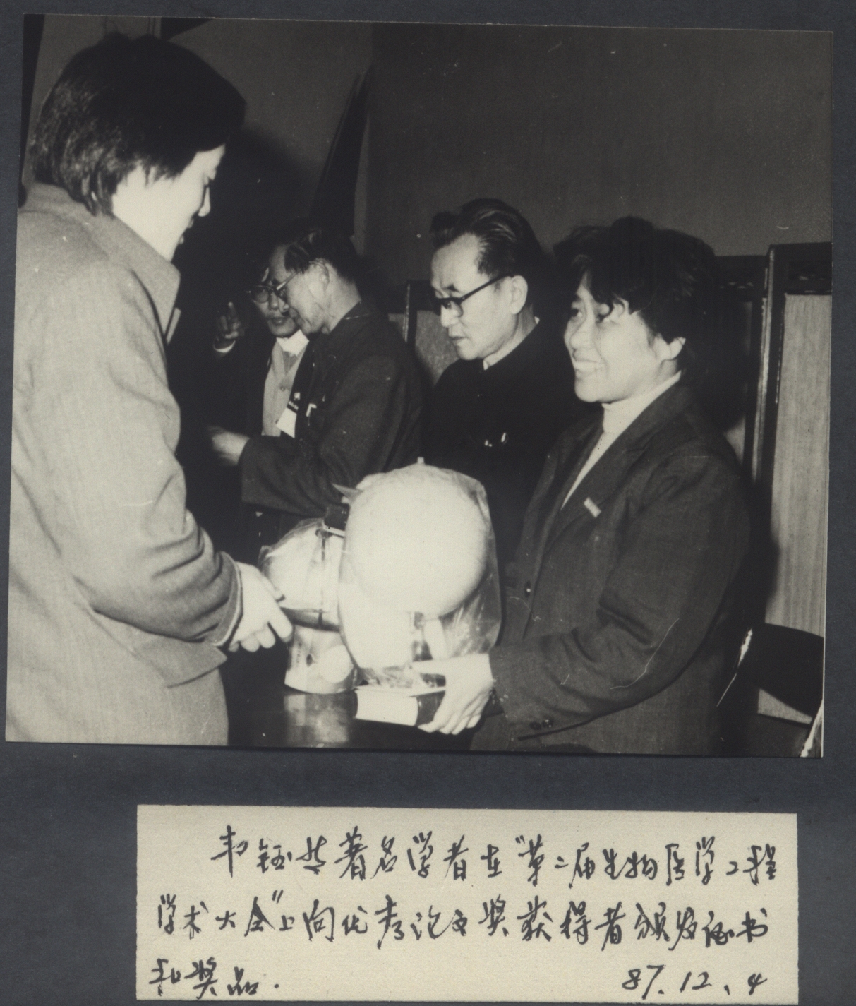 1987年12月04日韦钰等著名学者在“第二届生物医学工程学术大会”上向优秀论文获奖者颁发证书和奖品