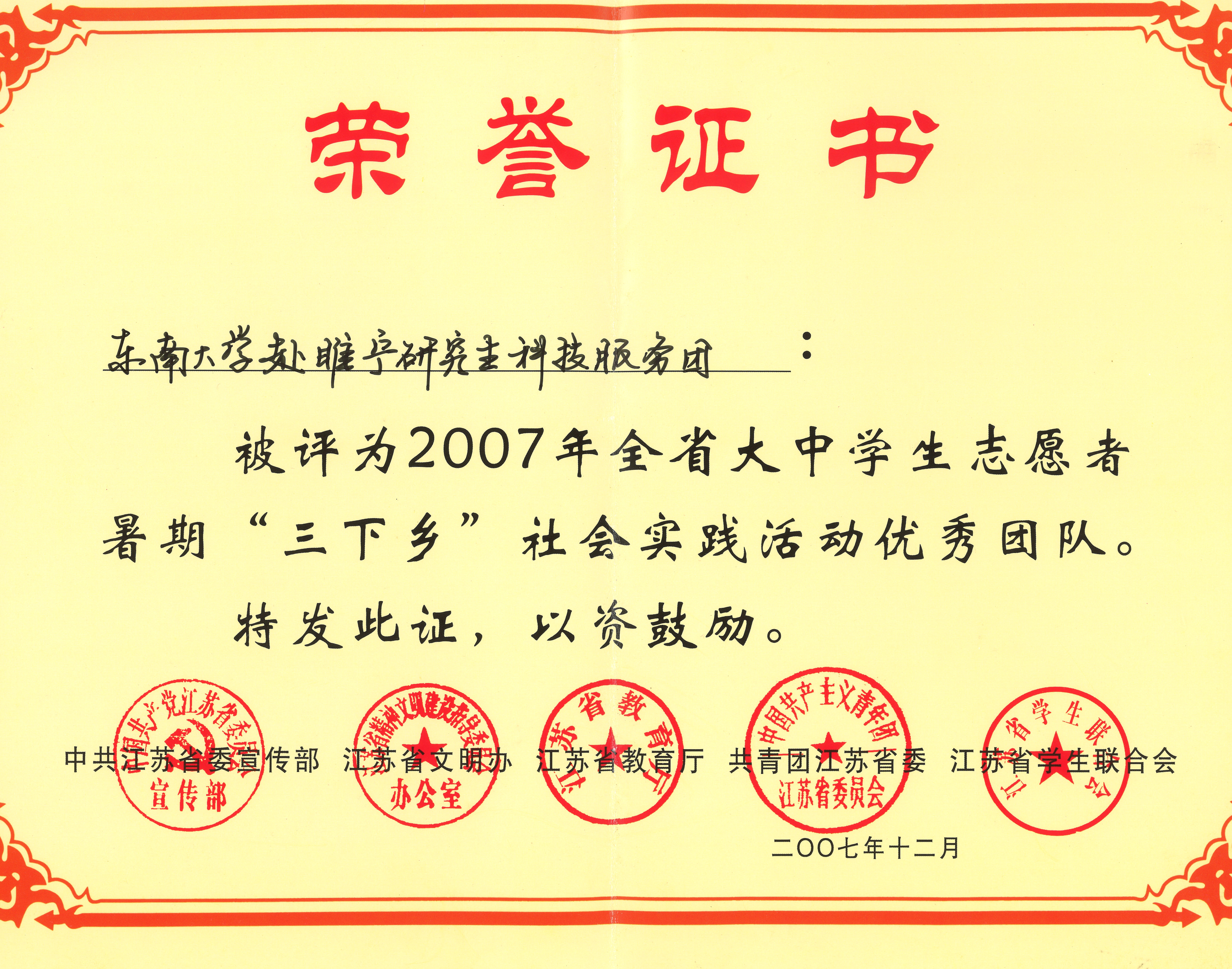 太阳成城集团tyc234cc古天乐赴睢宁研究生科技服务团被评为2007年全省大中员工志愿者“三下乡”社会实践活动优秀团队